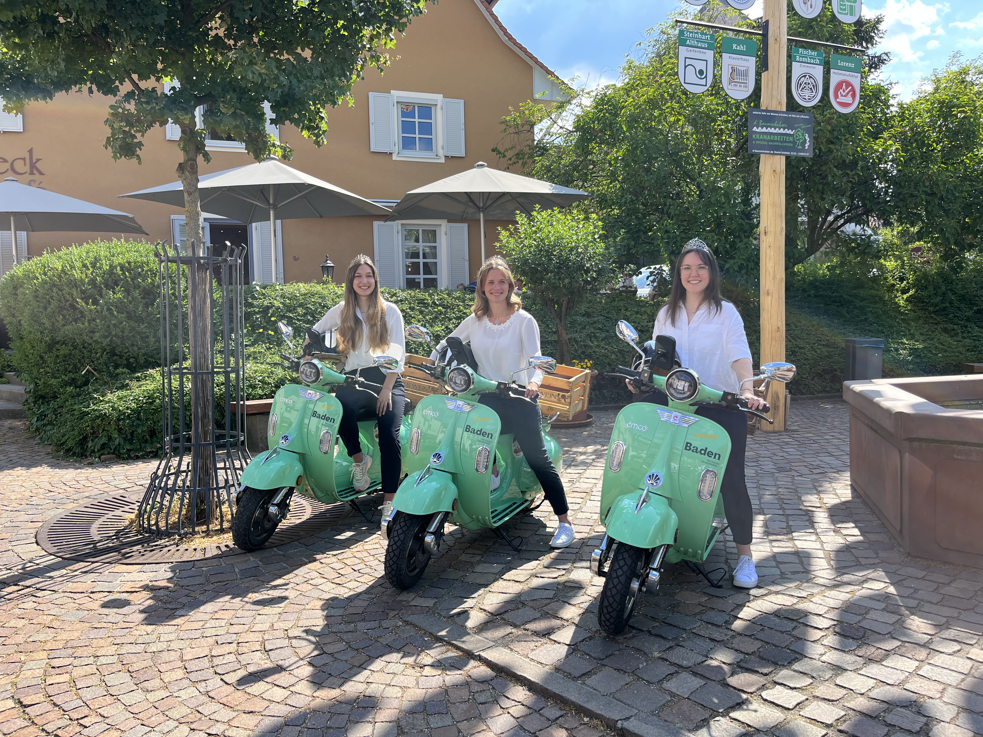 Von Kirchzarten aus sind die Badischen Weinhoheiten Jessica Himmelsbach, Geraldine Liebs und Lisa Huber heute vormittag auf E-Rollern zu einer 9-tägigen Tour durch das gesamte Anbaugebiet gestartet. Weinbaupräsident Zeller, der im Hotel Sonne den Tourstart eröffnete, lobte die kreative Idee und das Engagement der Repräsentantinnen, die mit dieser Aktion auf die Vielfalt des Weinanbaugebietes und seine touristischen Angebote aufmerksam machen wollen.