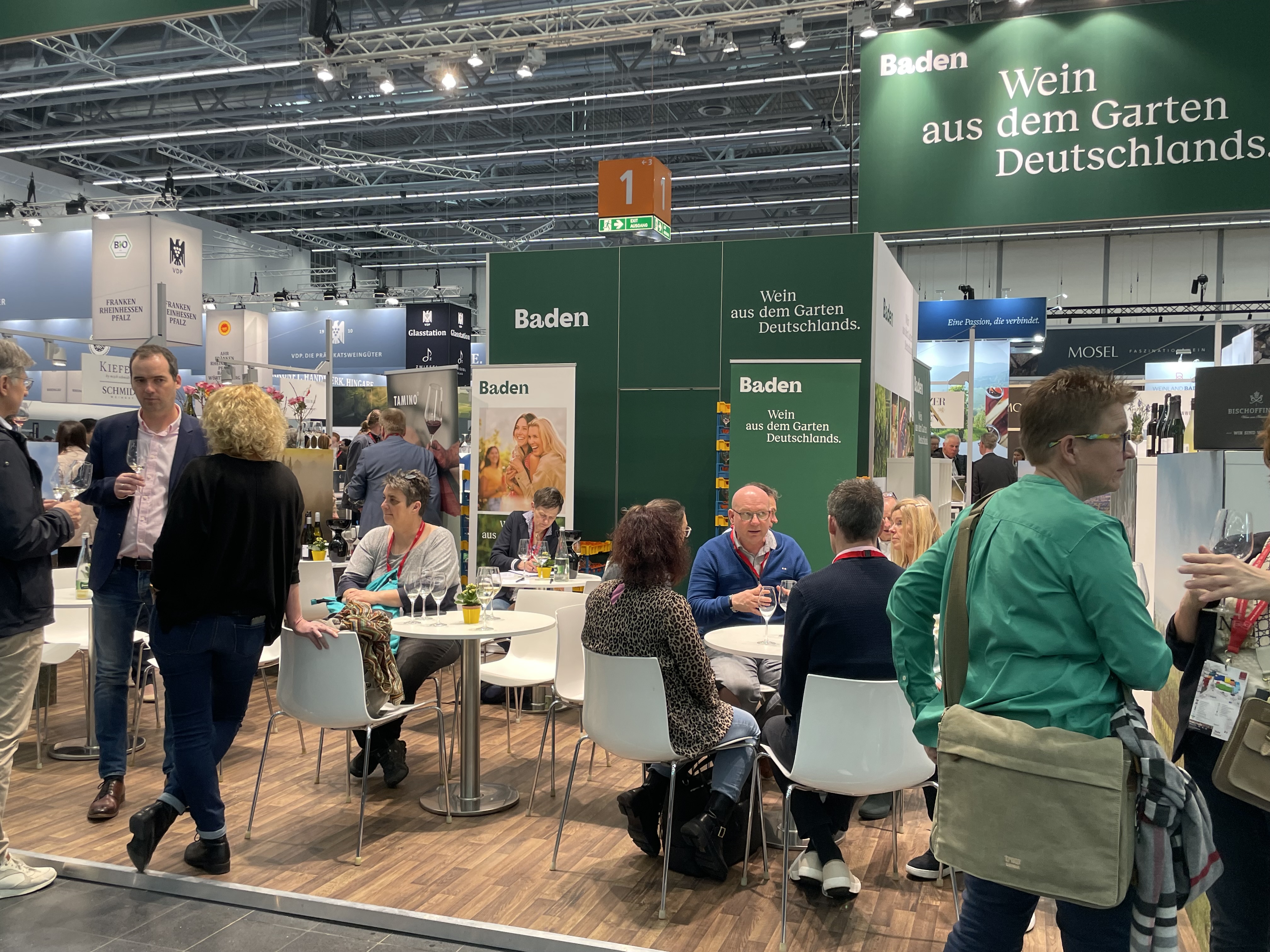 Der Baden-Stand ist schon von Weitem am prägnanten grünen „Baden“ Schriftzug zu erkennen und befindet sich in unmittelbarer Nachbarschaft zum Gemeinschaftsstand des VDP und in bester Gesellschaft weiterer badischer Aussteller wie der Weinland Baden Gruppe, dem Weingut und Privatkellerei Bimmerle sowie der Markgräfler Winzer eG.