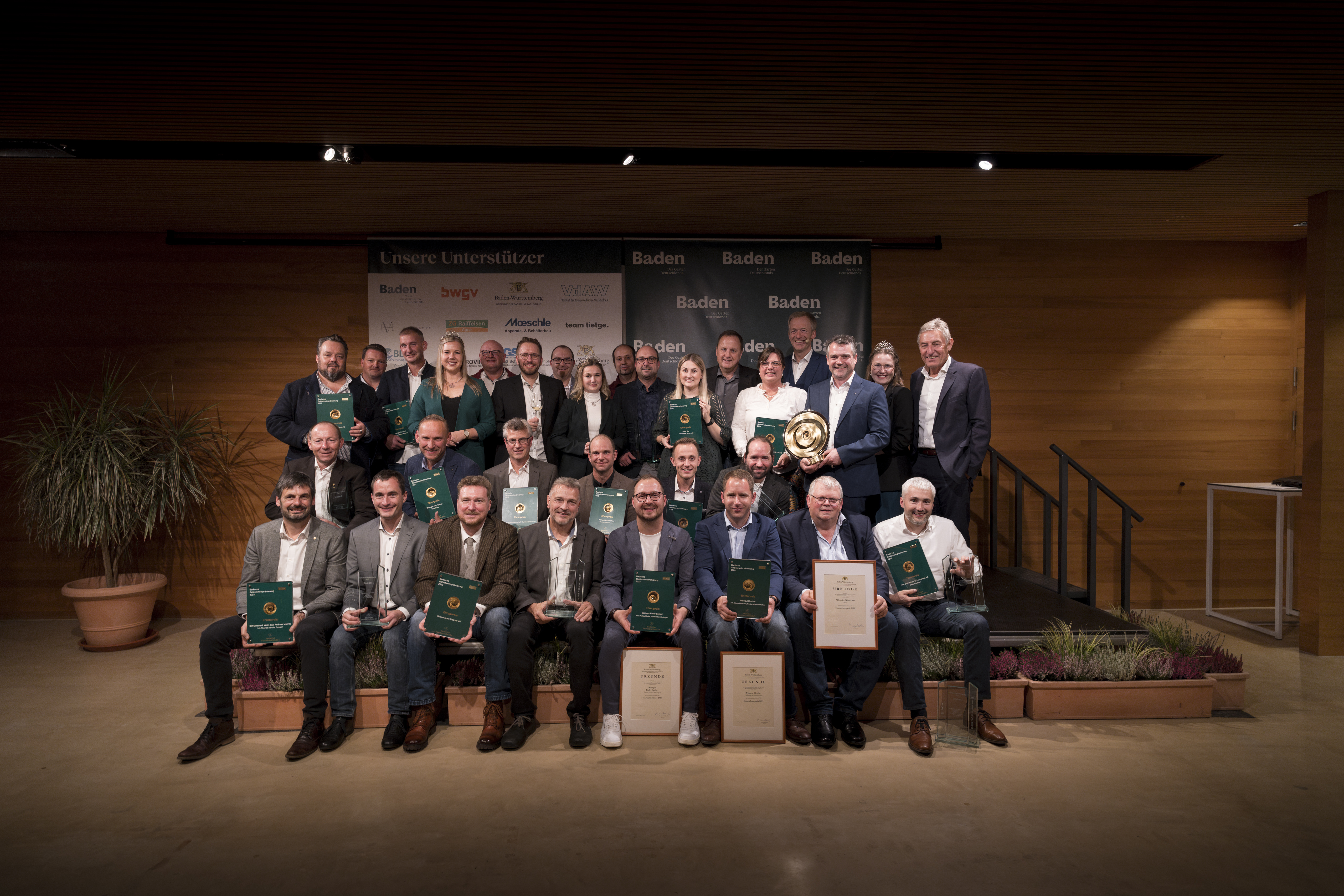 Die Preise in den Betriebsgrößenklassen gehen in diesem Jahr an die Weingüter Kiefer-Seufert (Ballrechten-Dottingen) und Schwörer (Durbach) (beide in der Gruppe I - bis 19,9 ha), an das Schwarzwaldweingut Andreas Männle (Durbach) (Gruppe II bis 49,9 ha), an die Winzergenossenschaft Rammersweier (Gruppe III - 50 ha - 149,9 ha), die Alde Gott Winzer Schwarzwald eG (Sasbachwalden) (Gruppe IV - 150 ha bis 299,9 ha) und die Durbacher Winzer eG (Gruppe V - 300 ha). Über den Sektehrenpreis darf sich wie bereits im Vorjahr die Burkheimer Winzer eG freuen.