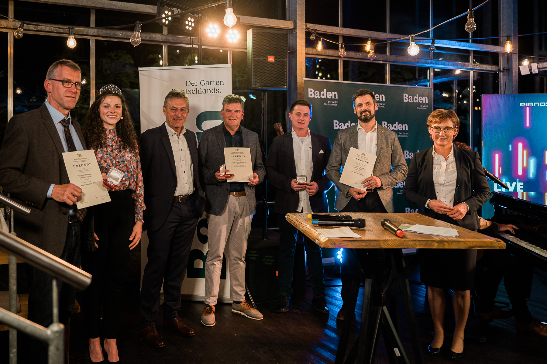stellvertretenden Geschäftsführer des Weinbauverbandes, Holger Klein, und den beiden Badischen Weinprinzessinnen Victoria Lorenz und Michaela Wille jeden Preisträger in kurzen Interviewrunden vorstellte. Untermalt wurden die einzelnen Programmpunkte von Livemusik des Duos Piano Vocal.