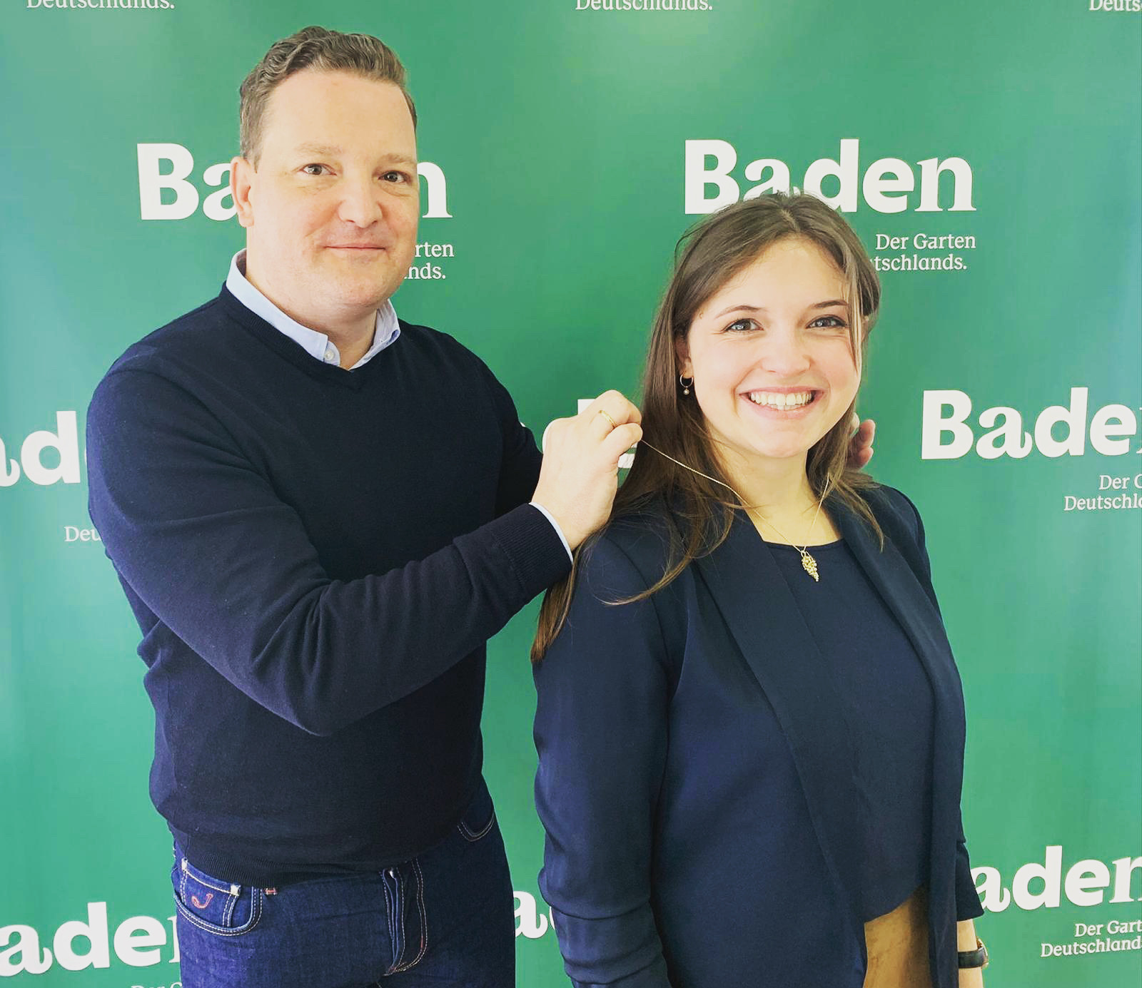 Anlässlich des Antrittsbesuchs der Deutschen Weinhoheiten Sina Erdrich (Baden), Saskia Teucke (Pfalz) und Linda Trarbach (Ahr) im Anbaugebiet Baden überreichte der Geschäftsführer des Badischen Weinbauverbands, Holger Klein, die goldene Kette des Weinbauverbandes an Sina Erdrich (Dt. Weinkönigin 2021/22, Badische Weinkönigin 2019/21). Klein lobte das große Engagement und den nahezu unermüdlichen Einsatz der aktuellen Deutschen Weinkönigin für ihr Anbaugebiet und die Badischen Winzerinnen und Winzer.